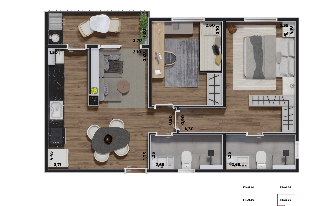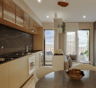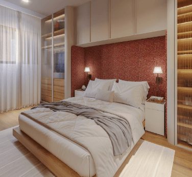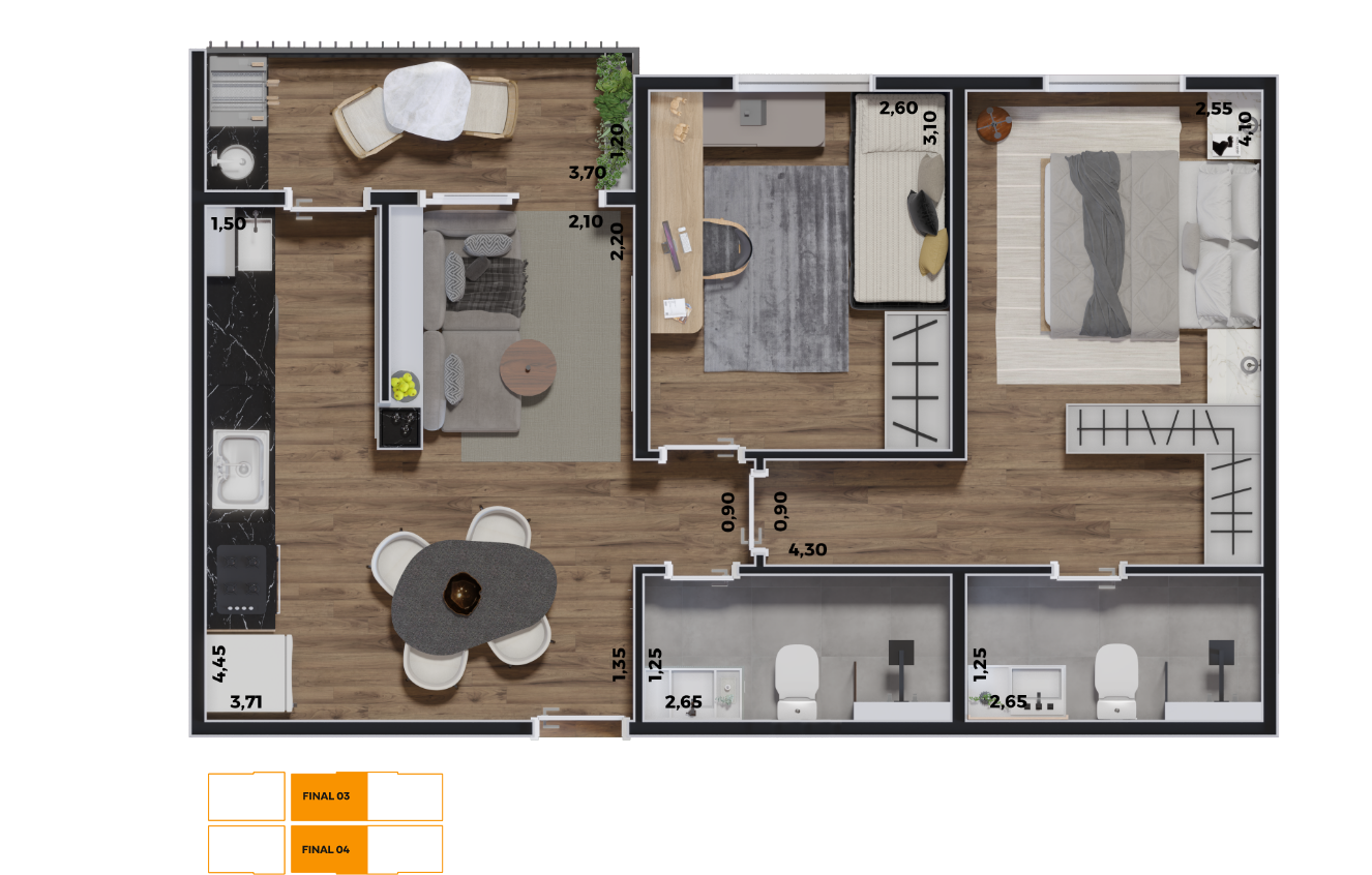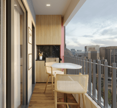 TIPO: 55,74m2 – 2 Dormitórios sendo 1 Suíte, Varanda Gourmet com churrasqueira ecológica a carvão, Cozinha, Área de Serviço, Living integrado com sala de estar e sala de jantar e banheiro.