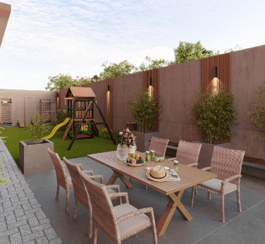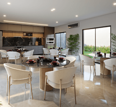 Garden: 96,74m2 – Sendo 55,74m² de área construída, com Espaço Gourmet integrado e quintal de 41m² – 2 Dormitórios sendo 1 Suíte, Varanda Gourmet com churrasqueira ecológica a carvão, Cozinha, Área de Serviço, Living integrado com sala de estar e sala de jantar, banheiro e quintal.